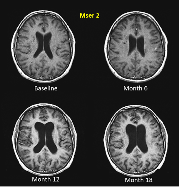 "The sets of MRI studies below are from two MSers with RRMS who were followed for 18 months; please note the degree of brain atrophy that occurred during this period of time? A picture is worth a thousands words and these images tell you how damaging MS can be to the brain."